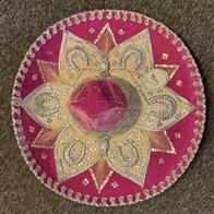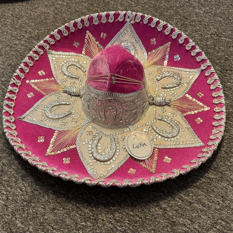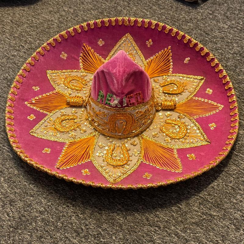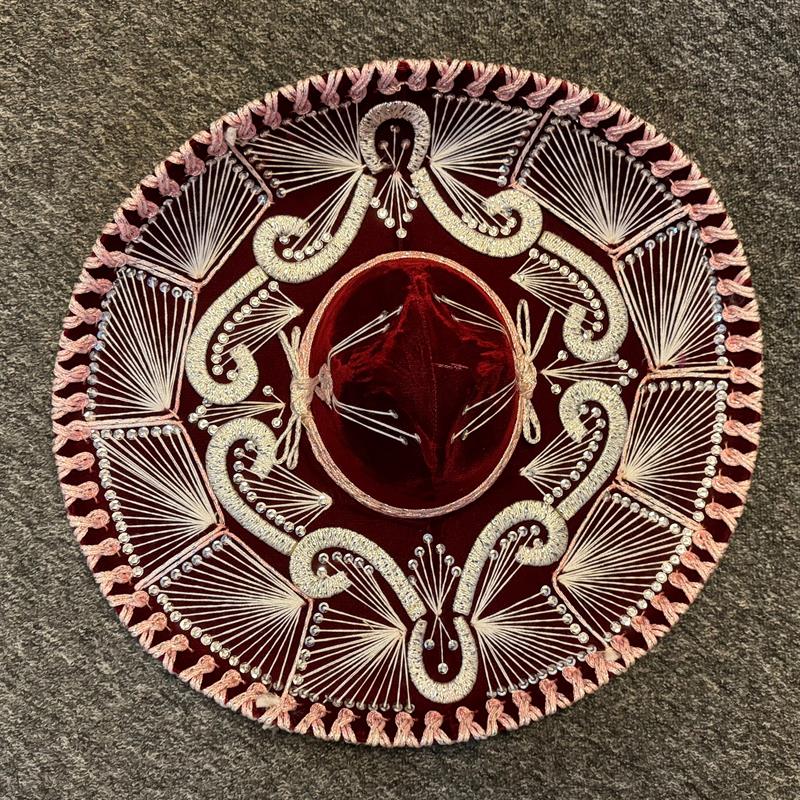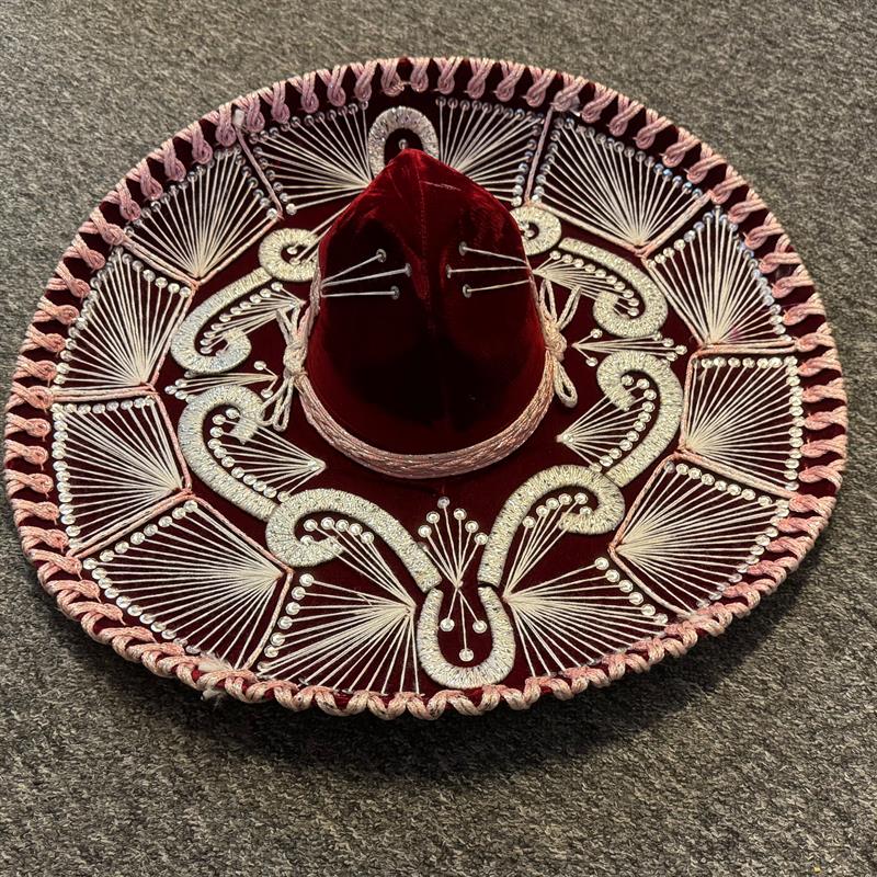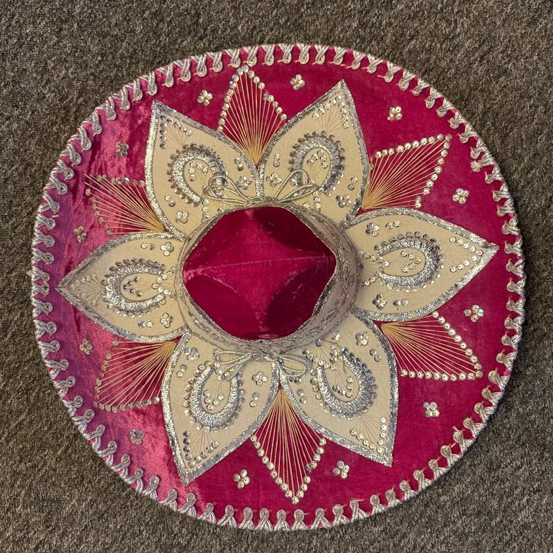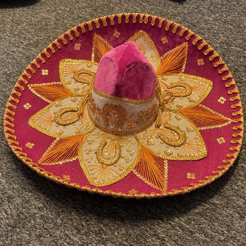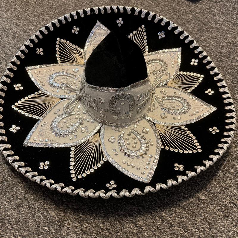 Ein Sombrero eignet sich auch für Auftritte im Theater, auf Ausstellungen und Messen, bei Pferdeshows, für Musikanten u.a.m. Schöne und besondere Dekoration für die Wand. Einzigartiger Hut für Sammler. Durchmesser 59 cm, hergestellt aus Filz auf Lochkarton-Schablonen. Gold- und Silberfäden bilden die Muster auf dem Hut. Los Sombreros bekannt aus der Mariachi-Musik